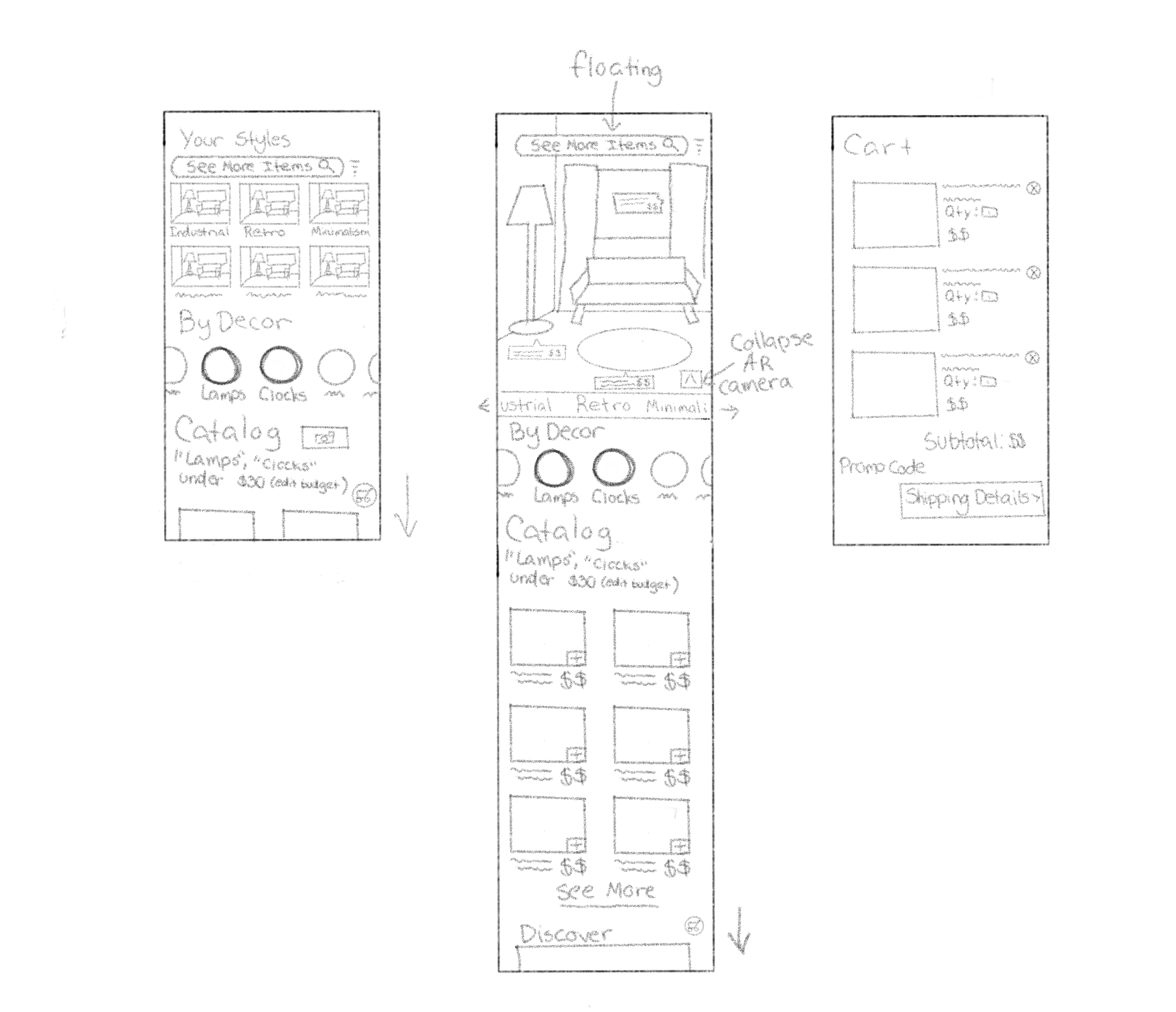 From the previous three sketches and end-to-end map, low fidelity designs are created to finish demonstrating the flow with the purpose of users making a purchase.