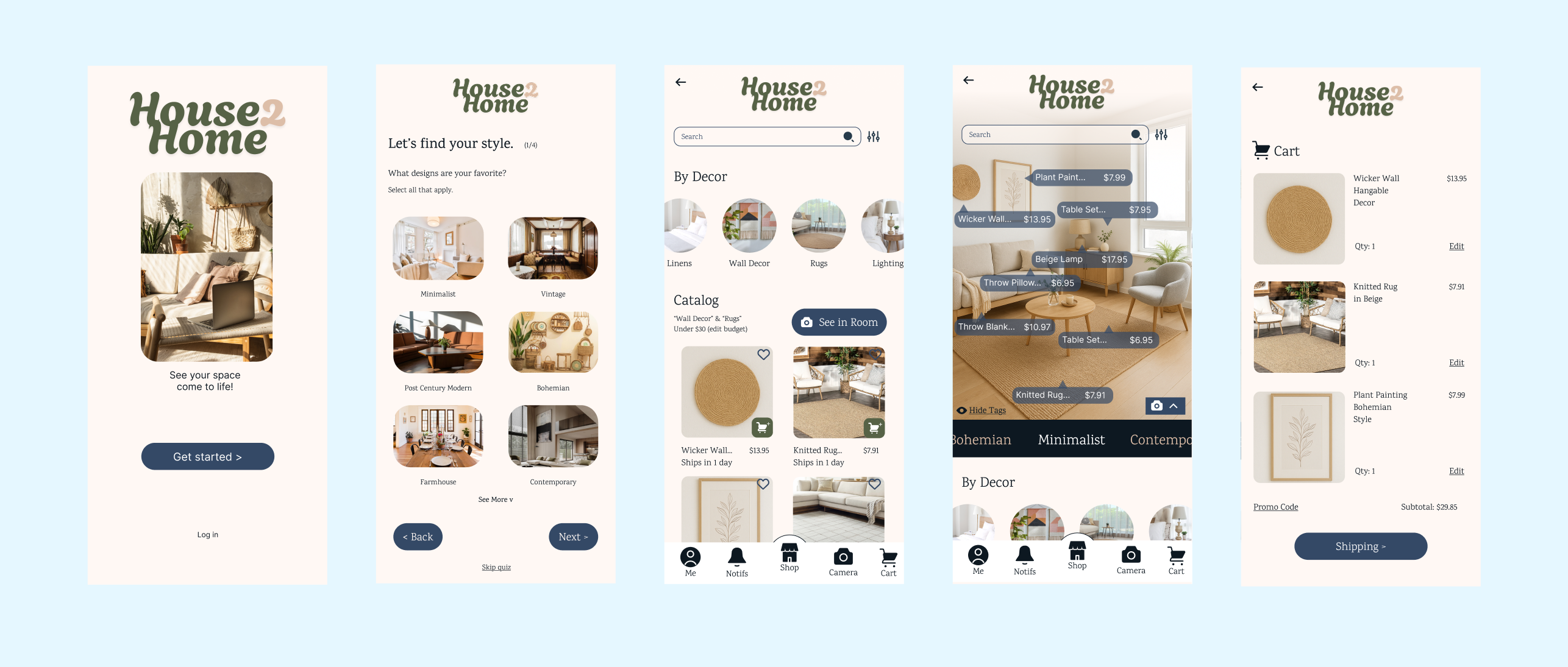 So far, the core functionality of House2Home is choosing from a pre-curated style selection (from the onboarding quiz users will take), filtering by item type, and selecting from the catalog. Users can optionally open the AR camera to view selected items in their room and use the search bar for more specific choices.