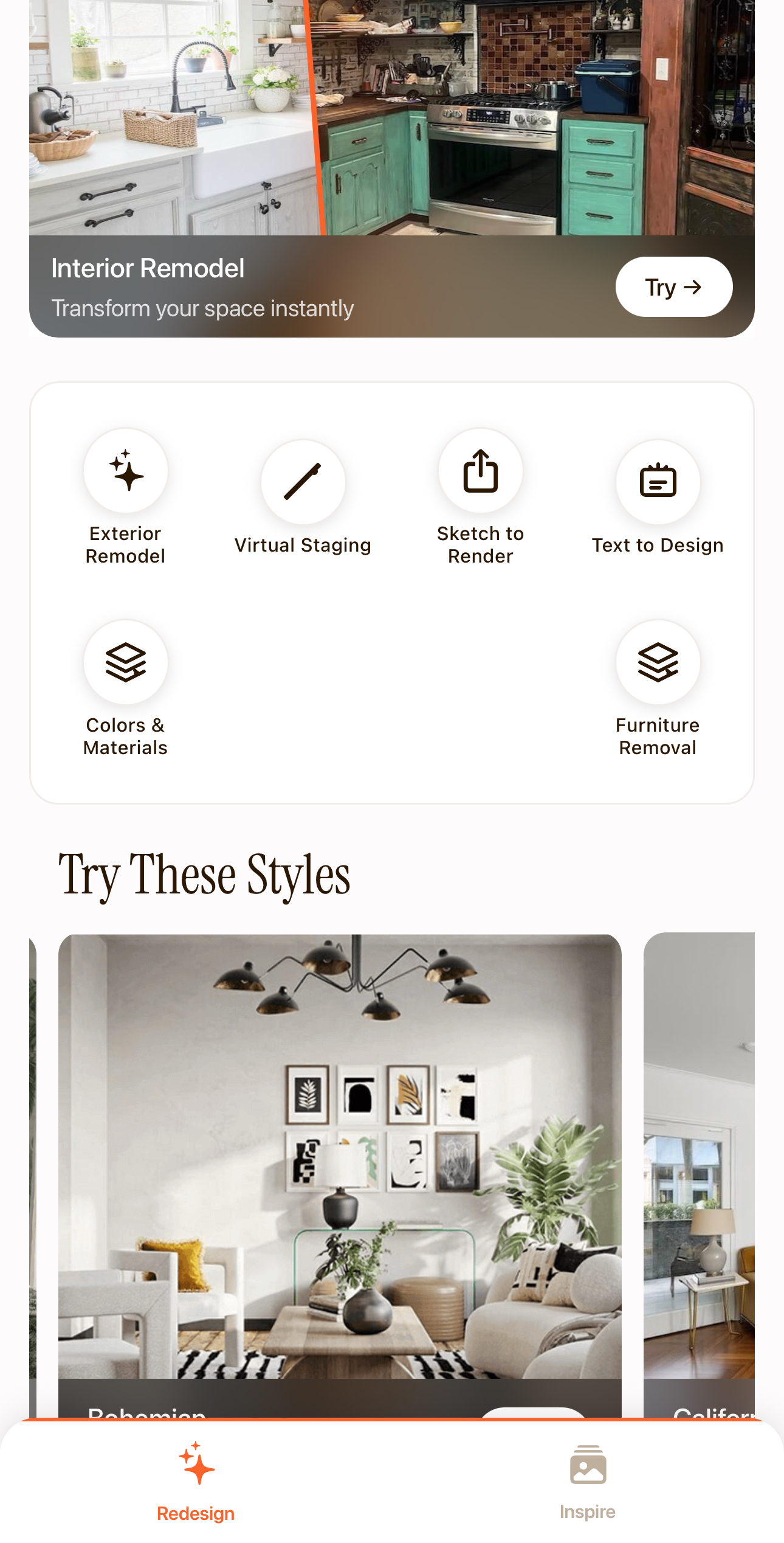 AI platforms like Remodelix AI allow users to take a still photo their room to generate inspirational ideas using AI. However, these apps don't really offer purchasable items for sale.