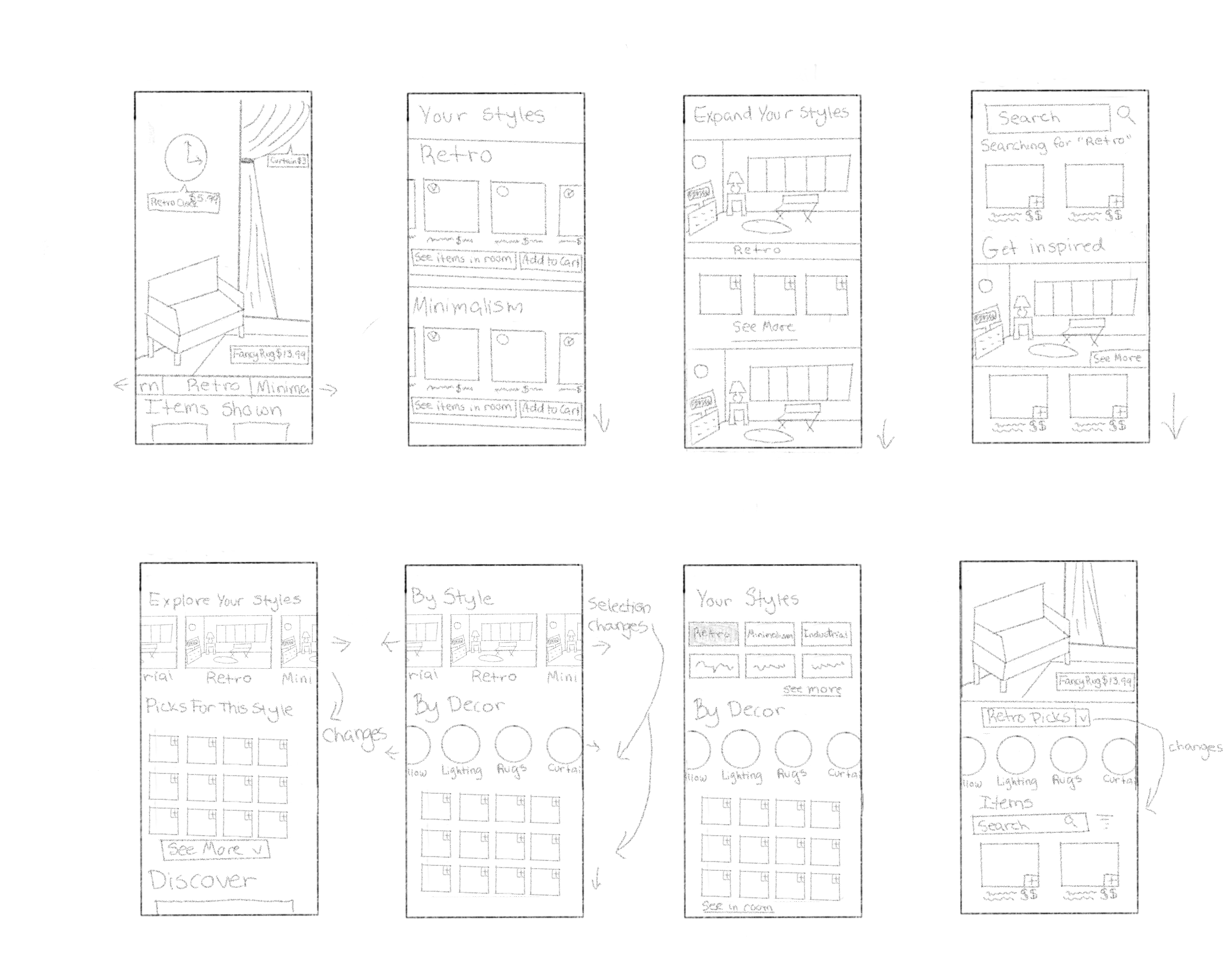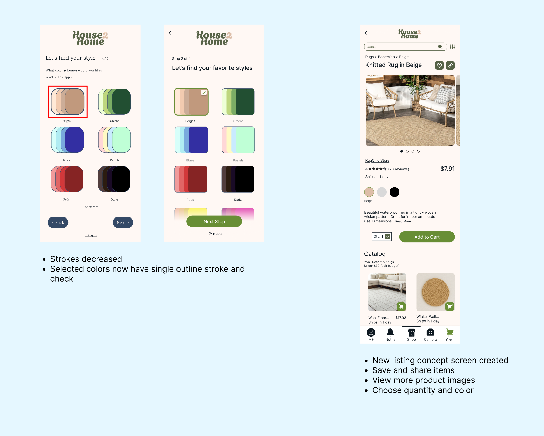 From the sketches, the first screen and some elements from other screens were chosen as the middle "key" step in the flow of purchasing items from House2Home. A previous and final screen demonstrates more closely how a purchase is completed from this key step.