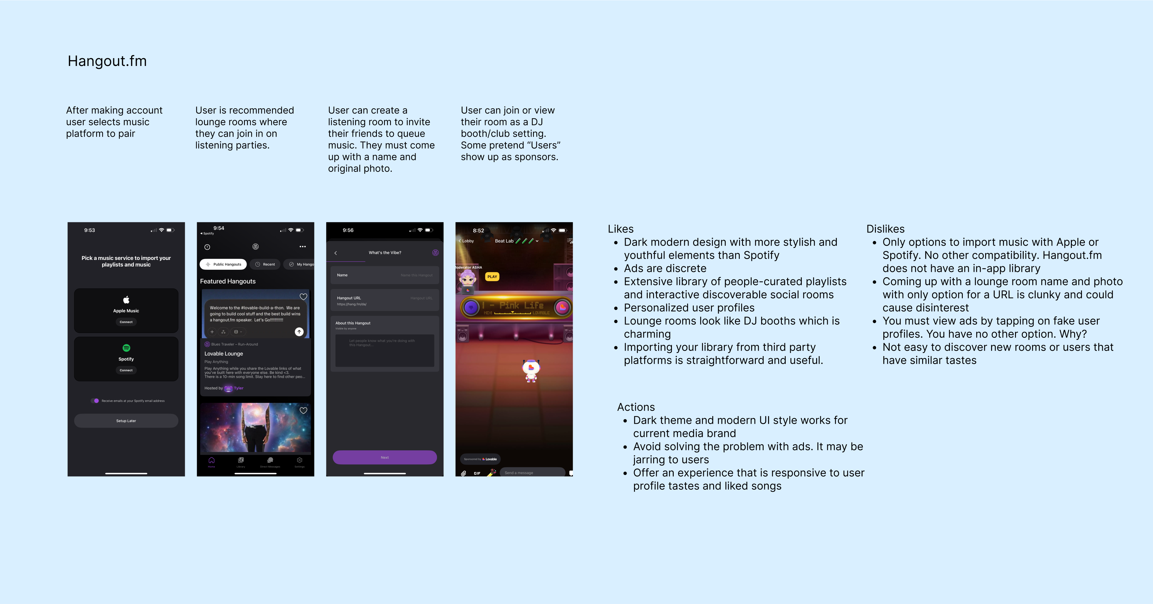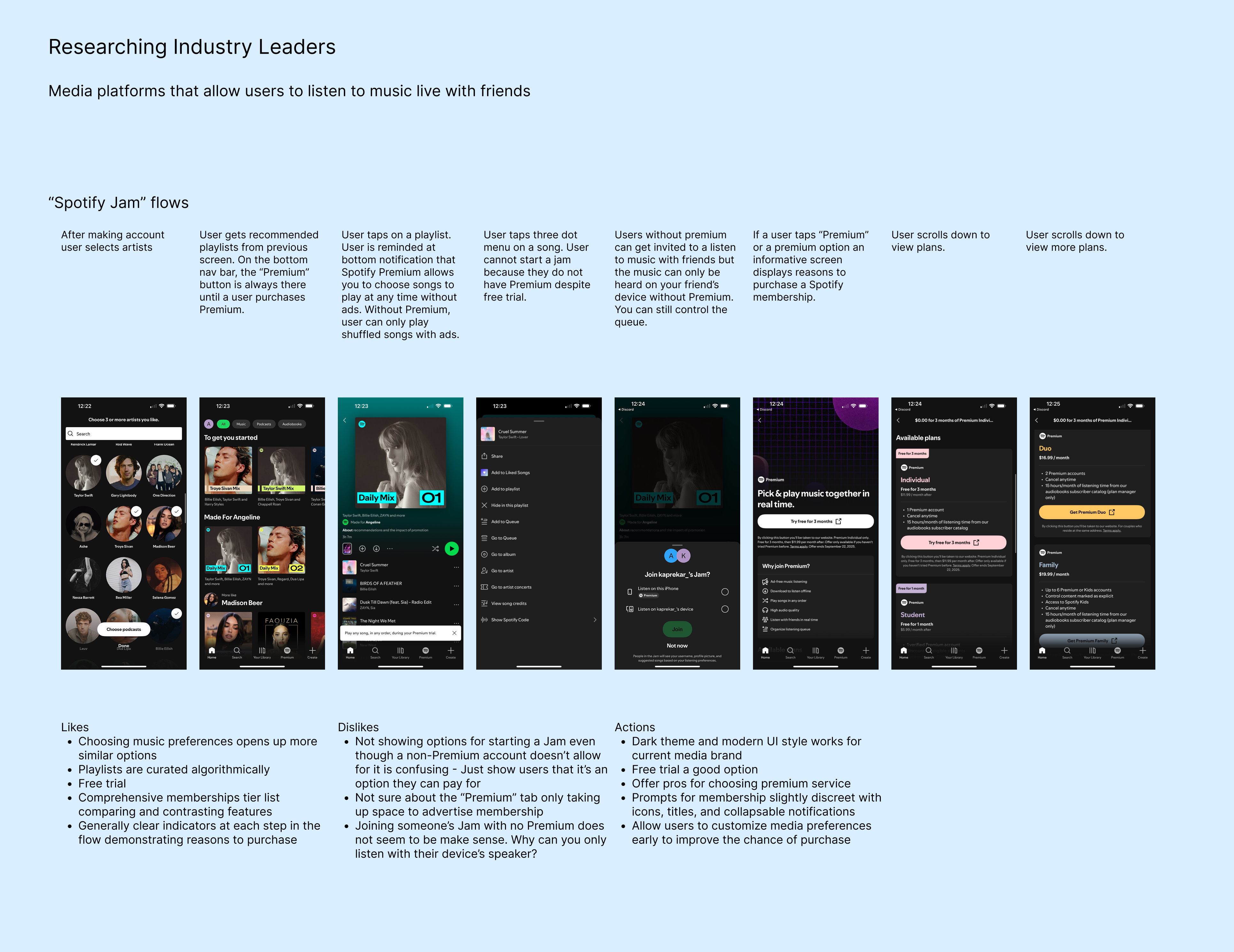 This analysis makes note of industry leaders in music media platforms, specifically those that are social. After listing subjective likes and dislikes about each flow, actionable goal ideas were created that can help pave the way for future design goals.