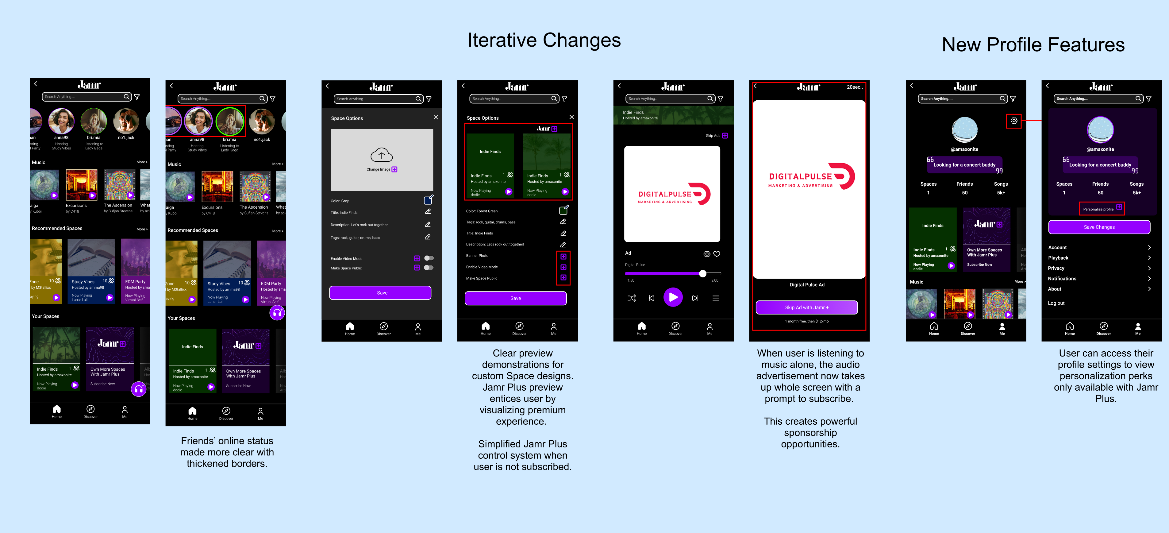 Jamr's new Plus features were created to work with Jamr's current brand identity and working wireframes. In the future, Jamr's subscription features may have an impact on future updates and brand identity. It is important to record users' responses to these new drastic changes and ideas to maintain a progressive, yet recognizable, outlook.