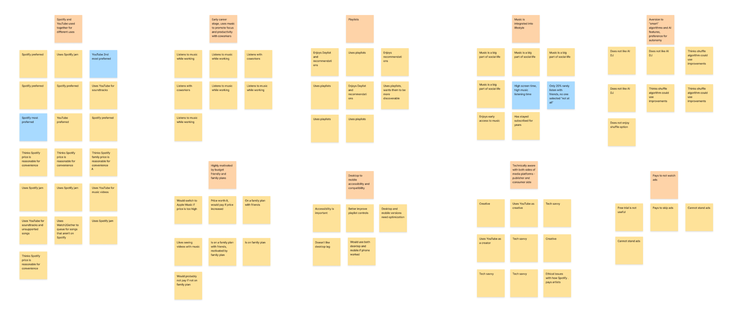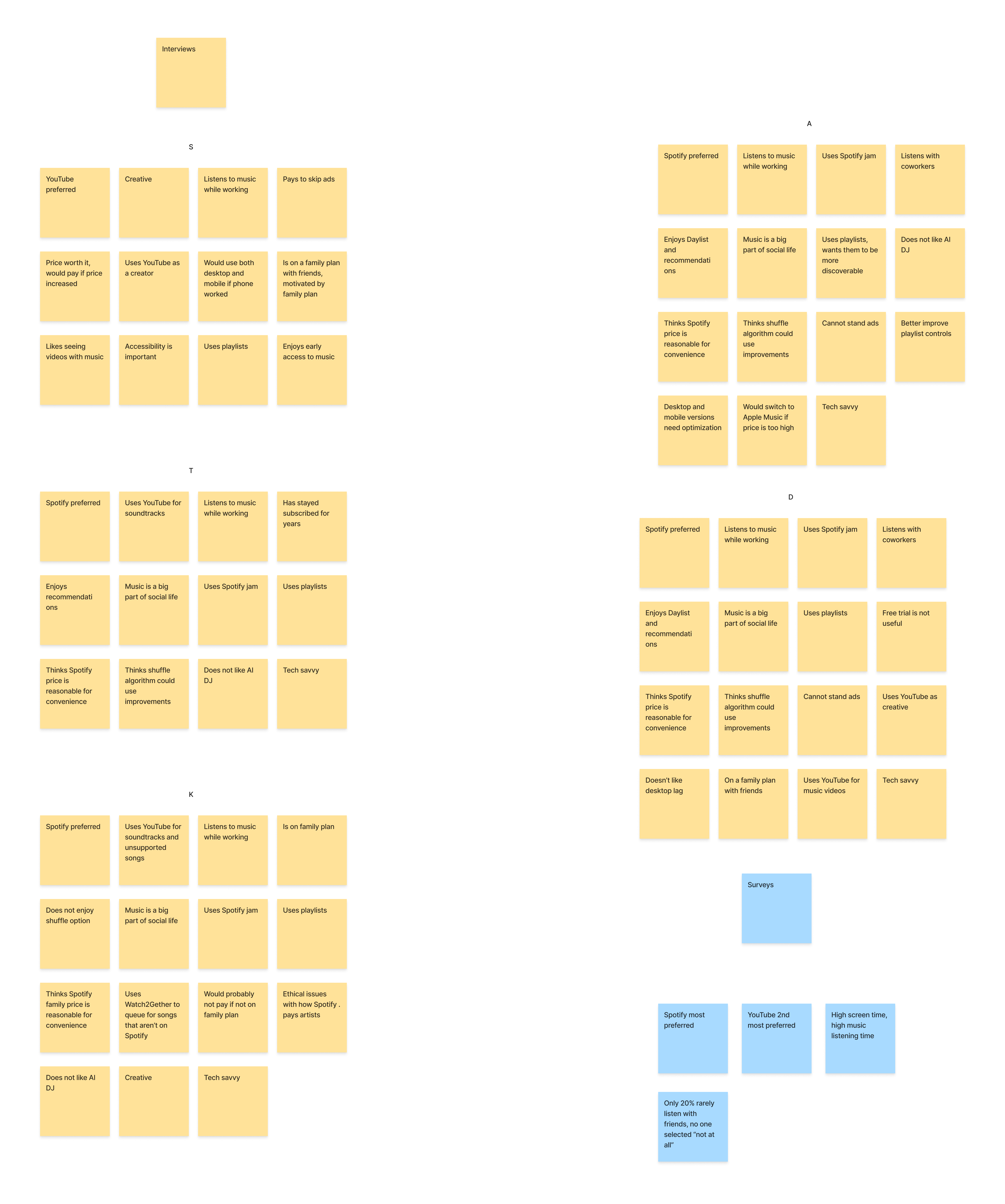 During a brainstorming session, key themes were noted from the results of the survey (blue) and interview process (yellow). These points were then arranged into like groups.