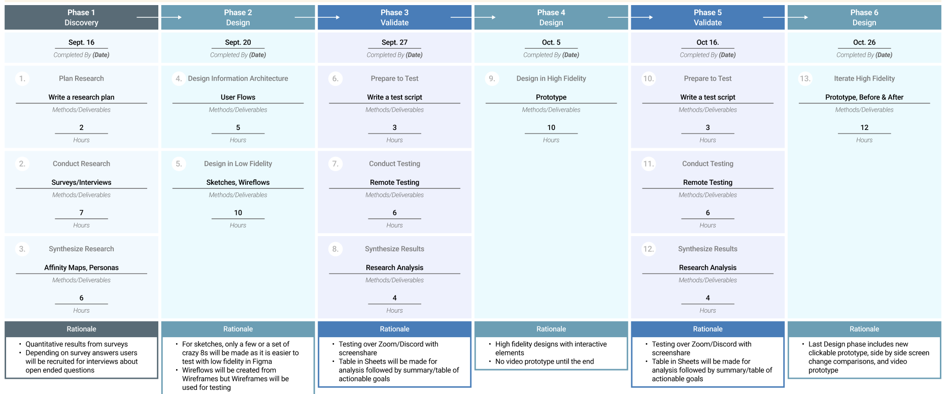 For this case, the project plan is cyclical. Data is gathered during the "Discovery" phase, and research is synthesized for the Design phase.In the plan, the Design and Validate process is iterated upon at various fidelity stages.