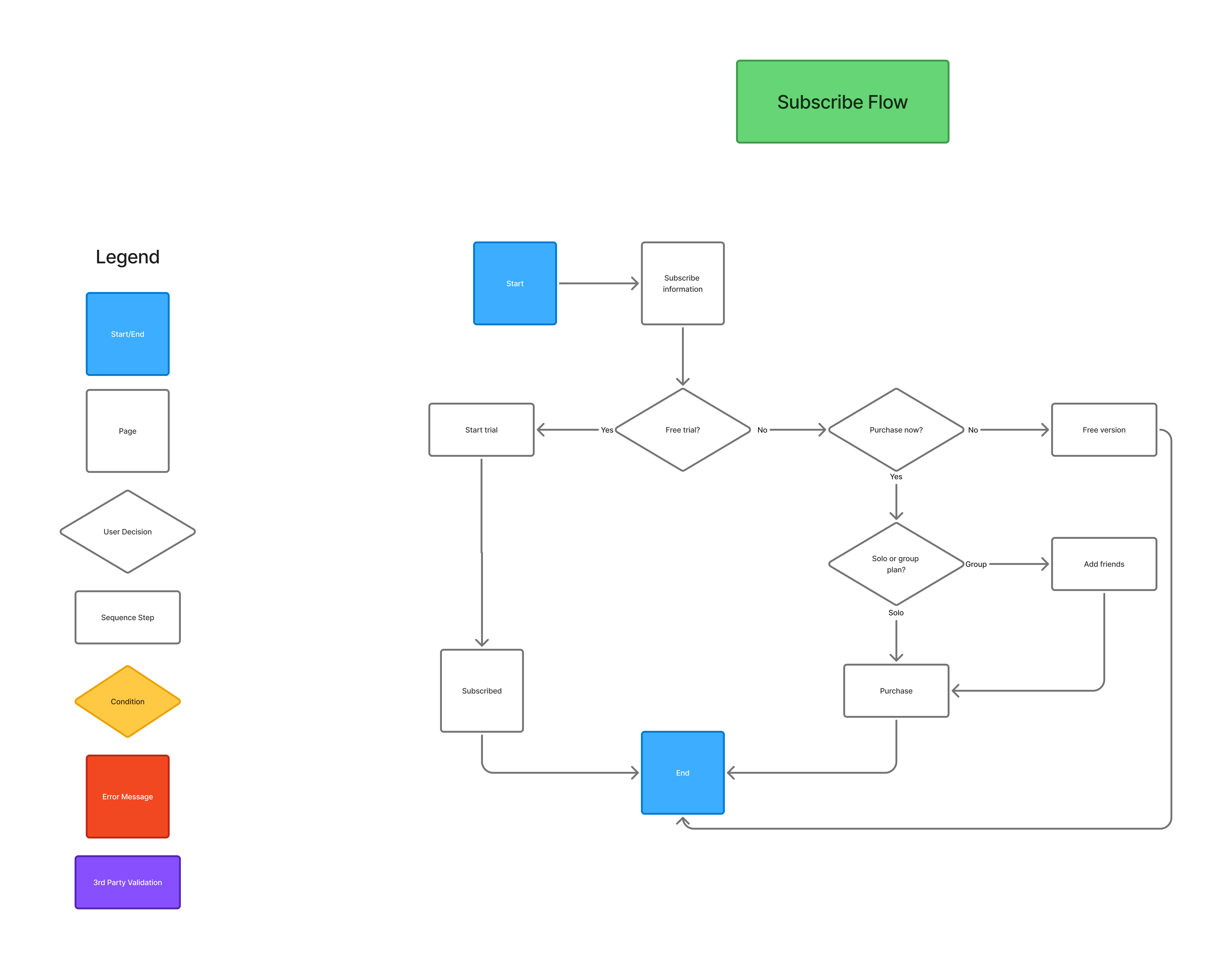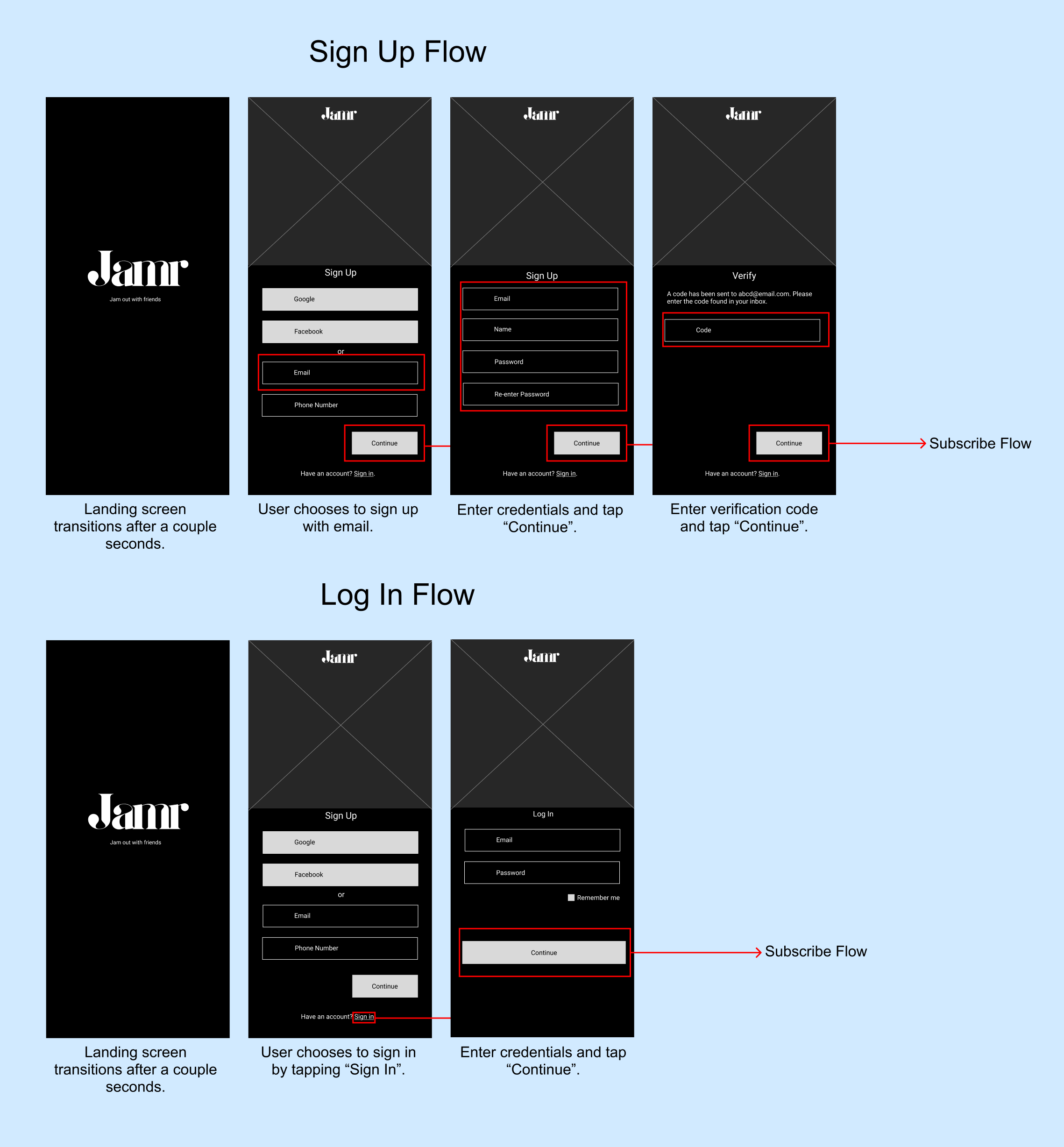 User flows play an important role in laying out the framework for concise user goals. These flows also help communicate to developers the conditions for advancing across screens.
