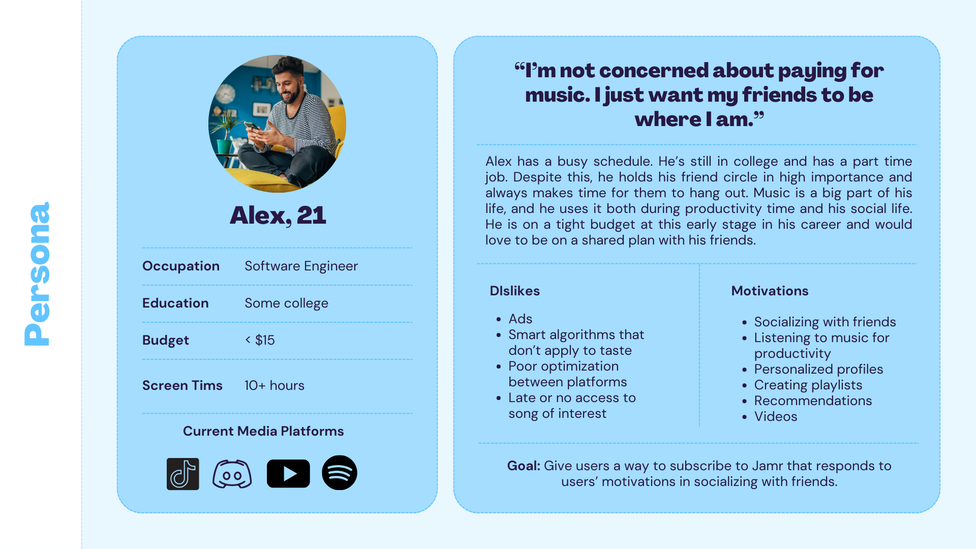 In combining Jamr's goal of offering premium services and users' goals of listening to music while fulfilling social needs, the following goal summarizes this persona: